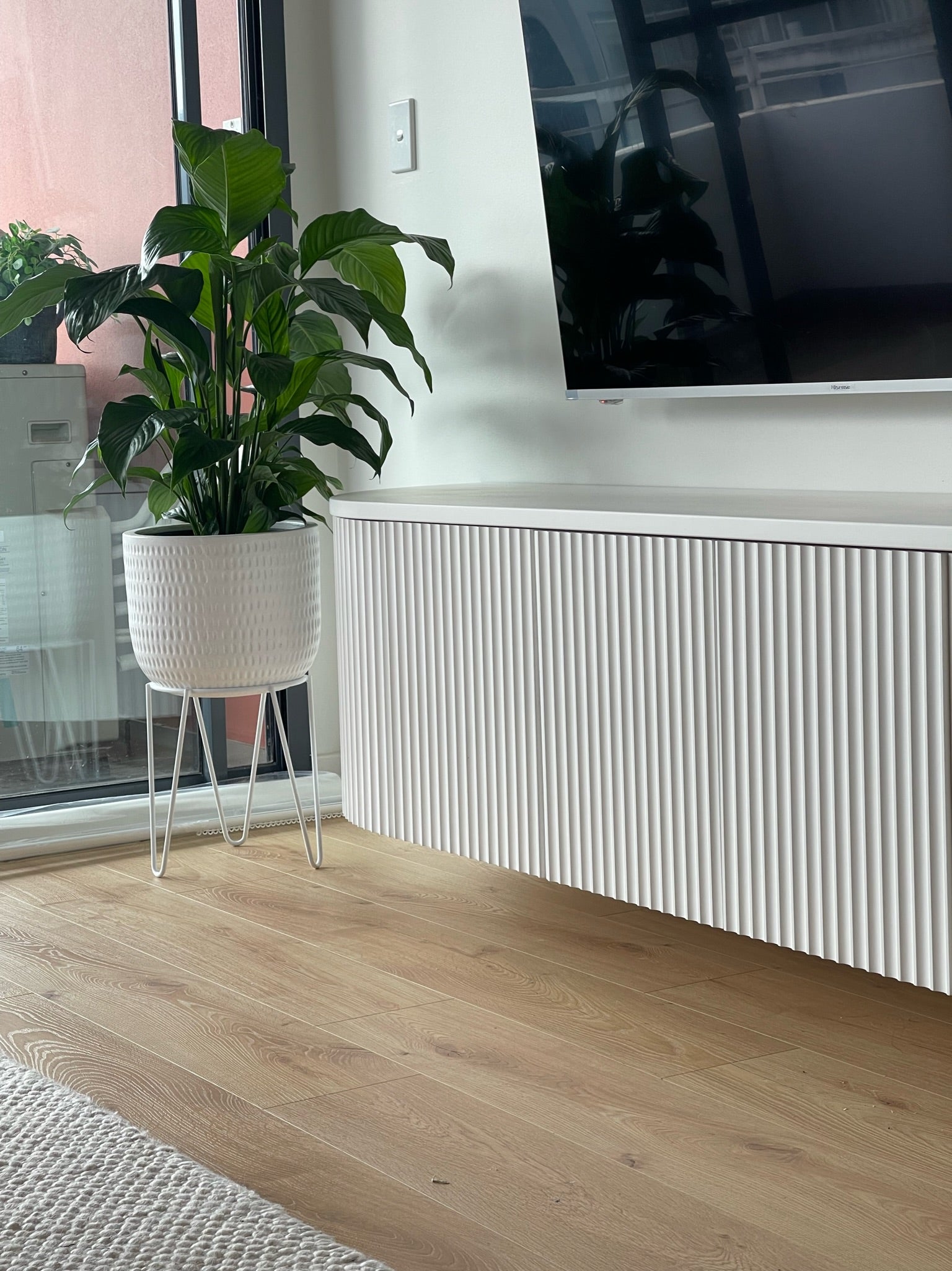 Introducing our Floating Curved Ripple ETU in timber. With a sleek ripple design, this wall mounted entertainment unit is equipped with push to open doors, adjustable shelves, and cable access in between each divider. The end to end ripple fixed panels and curved radius add a modern touch. Choose from a variety of Dulux colors to customise your unit.